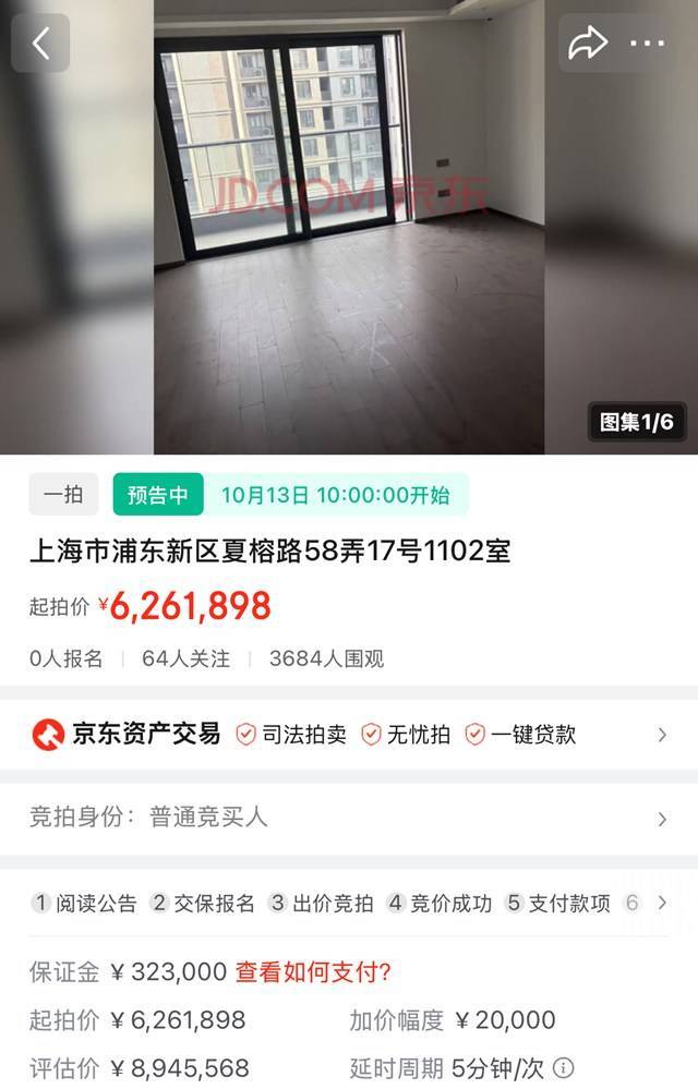 近日,位于上海市浦东新区唐镇板块的66套住宅房源,以远低于市场价的起拍价出现在京东资产处置平台上。