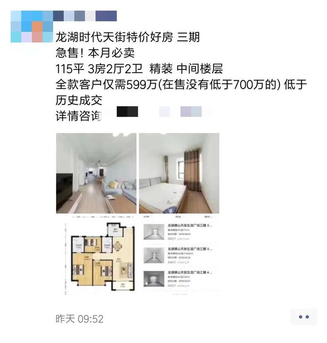 以龙湖时代天街三期为例,最近苏州中介发朋友圈表示,急售115㎡的精装户型,总价仅599万的。