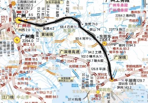 广深铁路线西起广州站,南至深圳站,全147公里,设有28个站场,7个客运站点,列车较高运行速度每小时200公里。它是广州市、东莞市与深圳市之间的城际快速客运专线,是珠三角城际快速轨道交通的主干线路之一,也是东南沿海快速铁路厦深段的城际联络线之一。