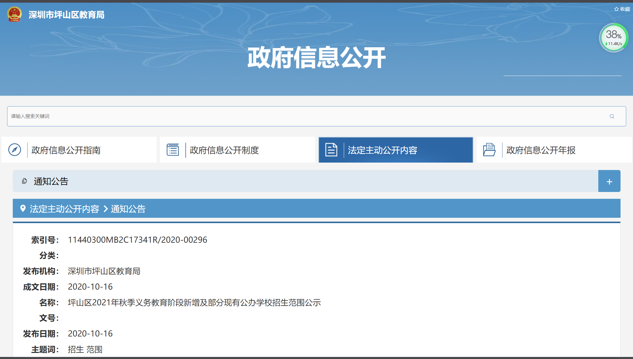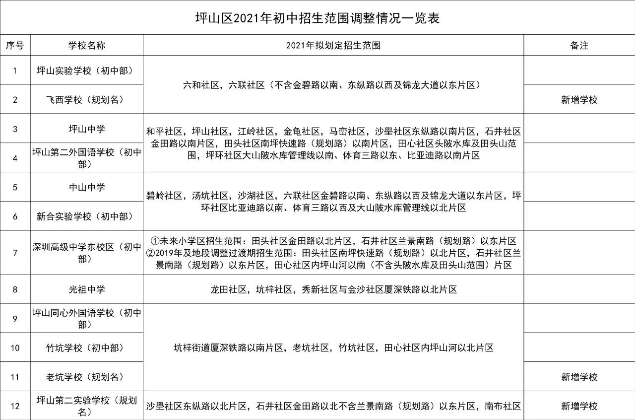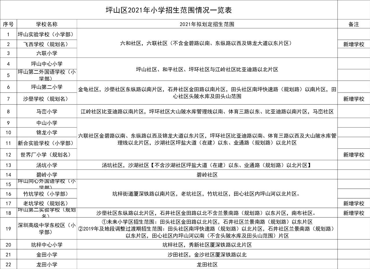 坪山区2021年预计有5所义务教育阶段公办学校建成开办。结合坪山区公办学校实际,现将5所新增公办学校及部分现有公办学校的招生范围向社会公示,公示时间为2020年10月16日-2020年10月26日。