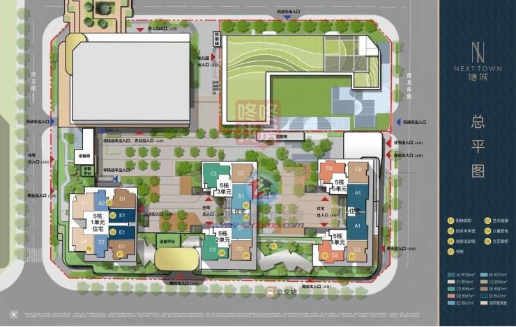 住宅包含6个单元楼,46-53层,共计约1508户。其中1栋2单元(46F)3梯5户,其余的1栋1单元(47F)、2栋1/2单元(47F)和3栋1/2单元(52-53F)均为3梯6户。集中商业位于4栋,约1.2万㎡,另配建有一所18班幼儿园。