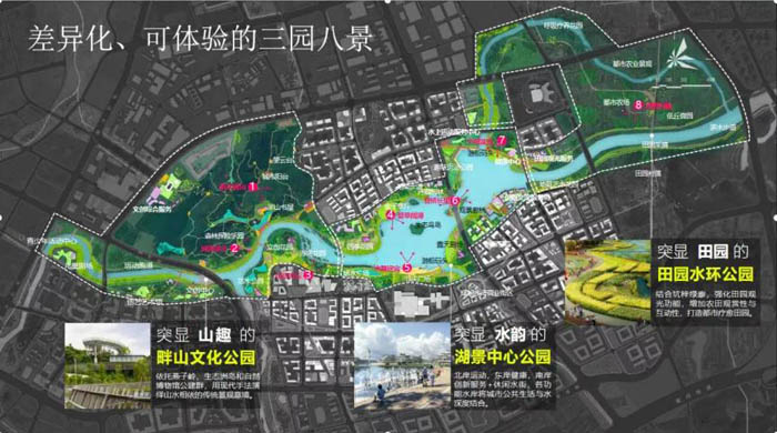强调人对山、河、湖等自然要素的感知和体验,以打造“三园(田园水环公园、湖景中心公园、畔山文化公园)”为主题,进一步提炼出富有当地特色、可体验的“燕岭八景”(曲水青山、河湾景亭、山亭齐云、碧草阔湖、水舞迎宾、登桥长望、夕阳波光、田野回眺),营造山湖城和谐统一、体验多样的标杆性城市空间,为深圳市率先打造人与自然和谐共生的美丽中国典范先行示范。