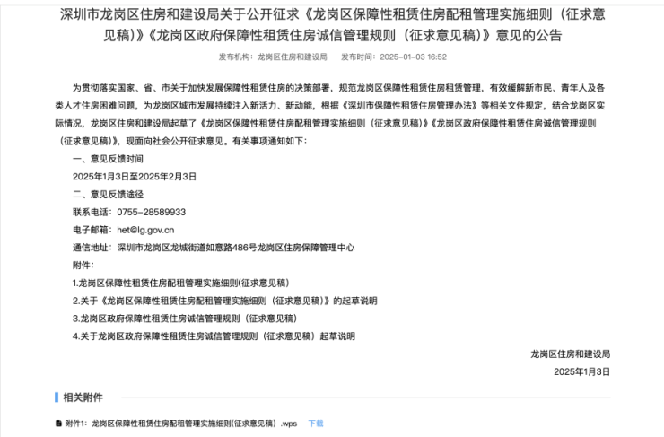 1月3日,龙岗区住房和建设局发布关于公开征求《龙岗区保障性租赁住房配租管理实施细则(征求意见稿)》《龙岗区政府保障性租赁住房诚信管理规则(征求意见稿)》意见的公告。