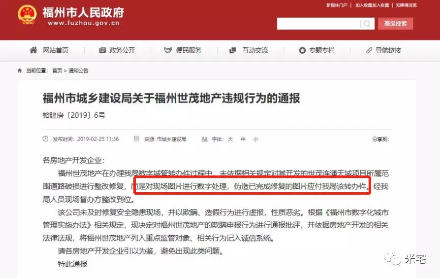 若不是福州市人民政府发出违规通报,恐怕很少人能想到,原来还可以这么干。通报中是这样说的:福州世茂地产,未依据相关规定对其开发的世茂连潘天城项目所属范围道路破损进行整改修复,而是对现场图片进行数字处理,伪造已完成修复的图片应付我局该转办件。经我局人员现场督办方整改到位。该公司未及时修复安全隐患现场,并以欺瞒、造假行为进行虚报,性质恶劣。入行至今,糊弄购房者的房企确实见过不少,但这么明目张胆、糊弄政府的还是排名前列次见。这操作,牛的一批! 从此,世茂摇身一变,成为了地产界最有名的P图大神。