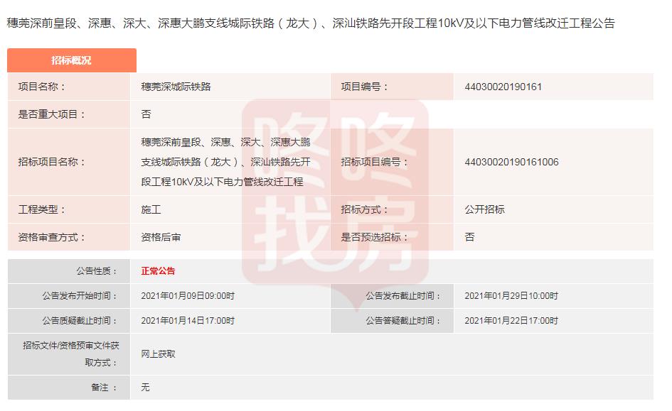 1月9日,深圳市住建局发布穗莞深前皇段、深惠、深大、深惠大鹏支线城际铁路(龙大)、深汕铁路先开段工程10kV及以下电力管线改迁工程招标公告。