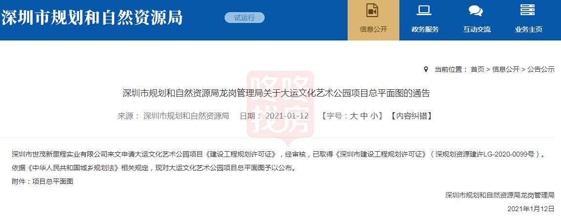 1月12日,深圳市规划和自然资源局发布关于大运文化艺术公园项目总平面图的通告。