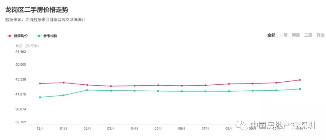 相关数据显示,从2017年12月到2019年4月,龙岗区二手房也仅破4字头,但二手成交均价却呈现上涨趋势,整体看,龙岗作为刚需片区,成交还是依旧比较活跃,但是购买力依旧处在静态水平,并未见有上涨趋势。