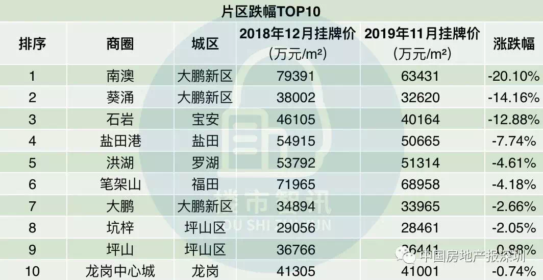 据诸葛找房统计,深圳2019年118个挂牌量较大的深圳二手楼盘中,有51个楼盘出现了降价,66个片区中,有11个片区挂牌价格下跌。截至2019年11月,在过去的一年里,龙岗大道1号业主挂牌大降18.33%,从一年前的47207元/m²“缩水”到今天的38553元/m²。以建筑面积86m²的户型计算,该盘跌幅达18%,跌价达到74万元,而在2019年年度挂盘价格跌幅TOP10楼盘中,跌幅排名第二的承翰半山海从38008元/m²到33936/m²,跌幅为10.71%。