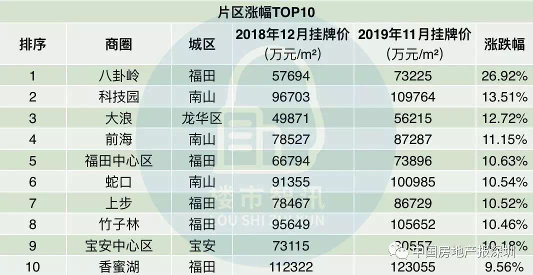 诸葛找房数据研究显示,在2019年深圳楼市片区涨幅TOP10中,福田占5席,南山占3席,龙华和宝安也各占1席。热门片区有八卦岭、科技园、大浪、前海、福田中心区、蛇口、上步、竹子林、宝安中心区以及香蜜湖。2019年跌幅前5片区中,原关外片区却占据了4席,如南澳、葵涌、石岩、盐田港等远郊,由于地面交通不畅、社区不完善,导致业主降价出售。
