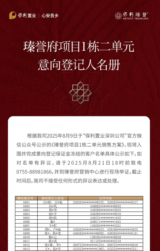 昨日(8月21日),宝中首个新规住宅新盘保利瑧誉,公示了1栋二单元意向登记人名册。