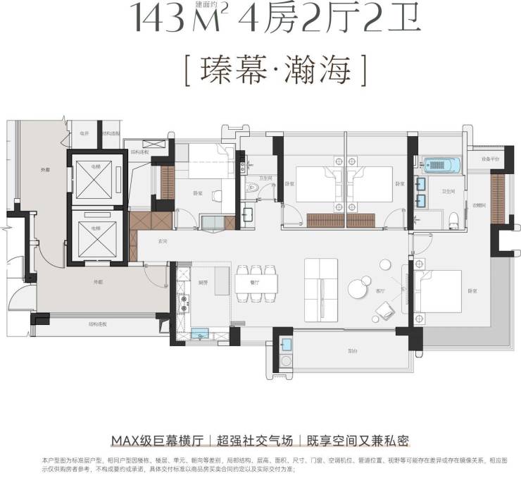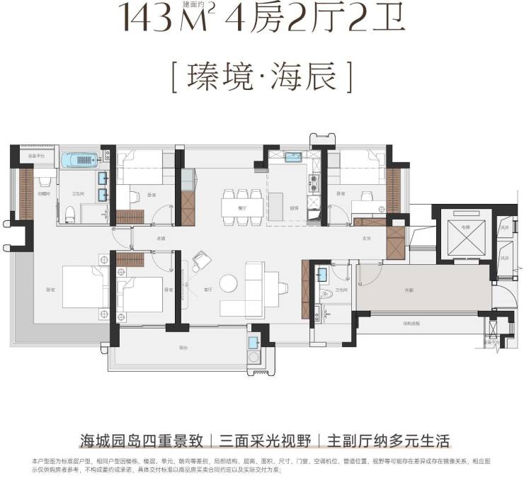 项目为纯四房小区,户型面积段约115-123-143㎡,最高实用率达到了108%,也是宝中片区首个新规住宅。