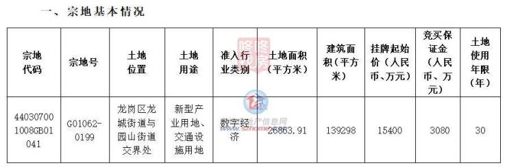 该宗地位于龙岗区龙城街道与园山街道交界处,准入行业为数字经济;用地土地面积为26863.9平米,建面约13.9万平,挂牌起始价1.54亿元,土地使用年限为30年。