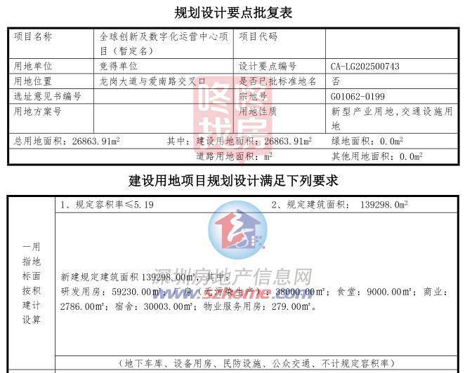 根据深圳市龙岗区产业项目产业发展监管协议显示,该地块将建全球创新及数字化运营中心项目。