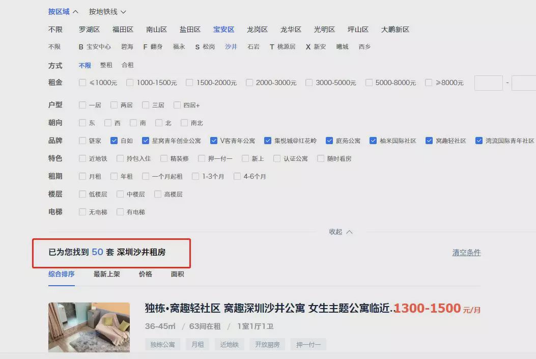 以在贝壳筛选沙井和福永的公寓情况为例,发现相比宝中、西乡和固戍等热门片区200+的房源,沙井和福永分别只有50、101套房源,而蛋壳公寓上福永只有6套房源。