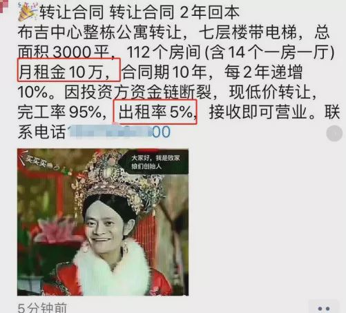 从江生转租信息可以看到,这个7层112间房的公寓月租金10万,出租率仅仅5%,也就是说每个月只有5000元的收入。