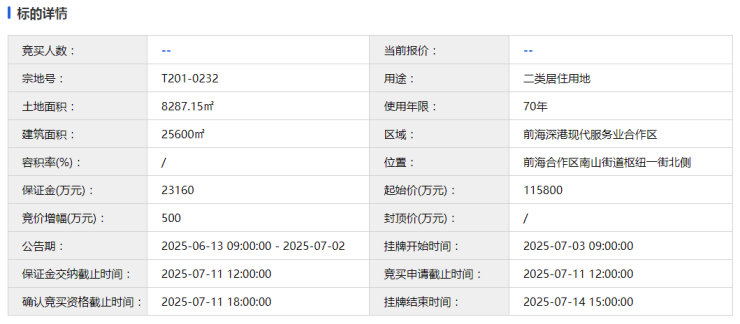 6月13日,深圳公共资源交易中心上架了位于前海合作区南山街道枢纽一街北侧的T201-0232宗地,土地面积8287.15㎡,建筑面积25600㎡,容积率3.1,土地用途为二类居住用地。