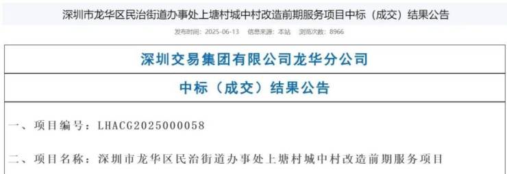 近日,深圳公共资源交易中心公告了龙华民治街道办事处上塘村城中村改造前期服务项目中标(成交)结果,中标人为深圳市天健城市发展有限公司,联合体成员(中建三局城市投资运营有限公司),中标(成交)金额:3400万。