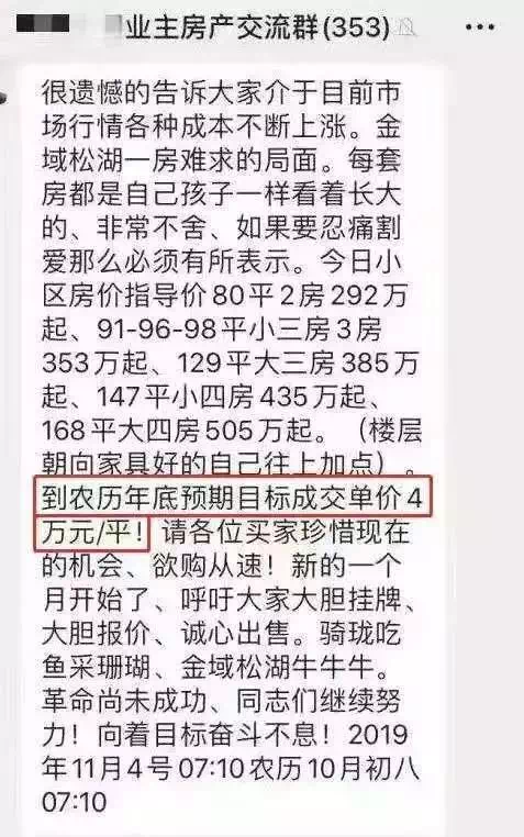 随后,网上流传出松山湖某楼盘业主交流群“指导房价”的截图,发言者呼吁邻居提高房源的挂牌价。