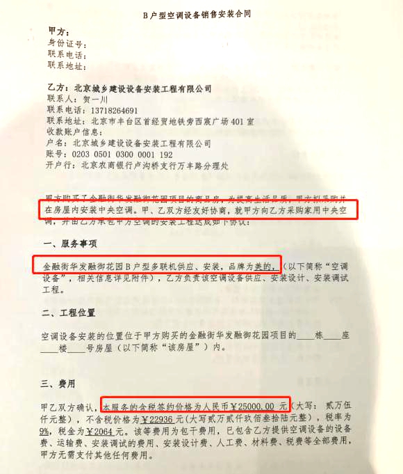 金融街开发商单方面选定的供应商---美的品牌中央空调,其签约主体为北京城乡建设设备安装工程有限公司。