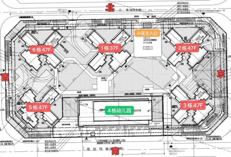 规划由5栋37-47层高的住宅和1栋4层高的幼儿园组成,其中:1栋37层、2、3、5、6栋47层,均为一层5户,采用半围合式设计,基本也都是新规多飘窗高得房率的产品…