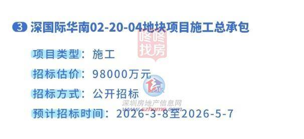 其中,包括深国际华南02-20-04地块项目施工总包招标,该项目招标估价约9.8亿,预计2026年3月8日-5月7日进行公开招标。