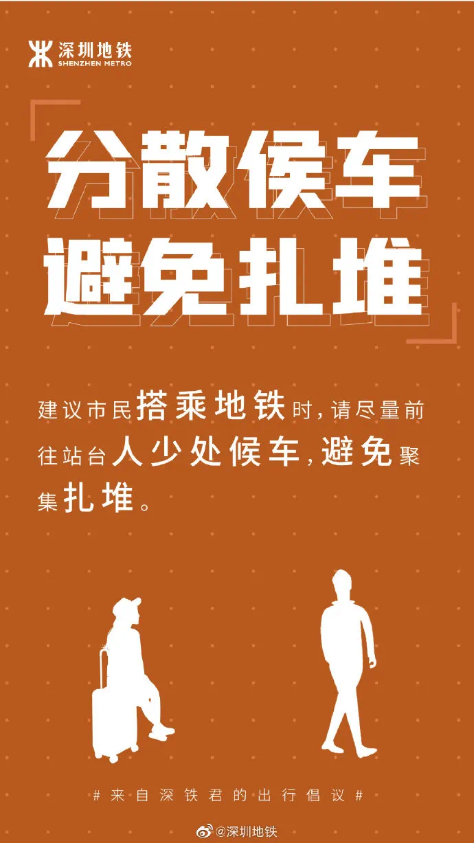 疫情期间为了大家的安全和健康深圳地铁也倡议大家▼①错峰出行,降低风险;②自觉排队,保持间隔;③分散候车,避免扎堆;