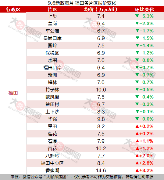 监测的福田区22个片区中,新政后挂盘均价下跌的片区共有14个,上涨的片区共有7个,1个片区价格几乎不变。