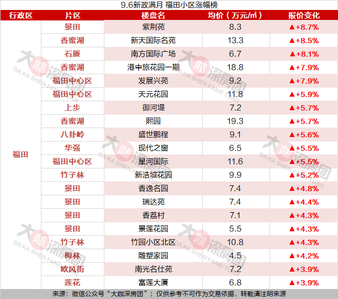 涨幅最高的小区是景田片区的紫荆苑,目前业主报价在8.3万元/㎡,涨幅8.7%。