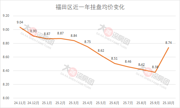 2025年10月,福田区挂盘均价为8.74万元/㎡,上涨了4.28%。