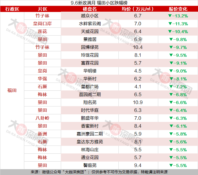跌幅榜中目前单价最高的是景田片区的翔名苑,业主报价在10.9万元/㎡,跌幅在6.6%。