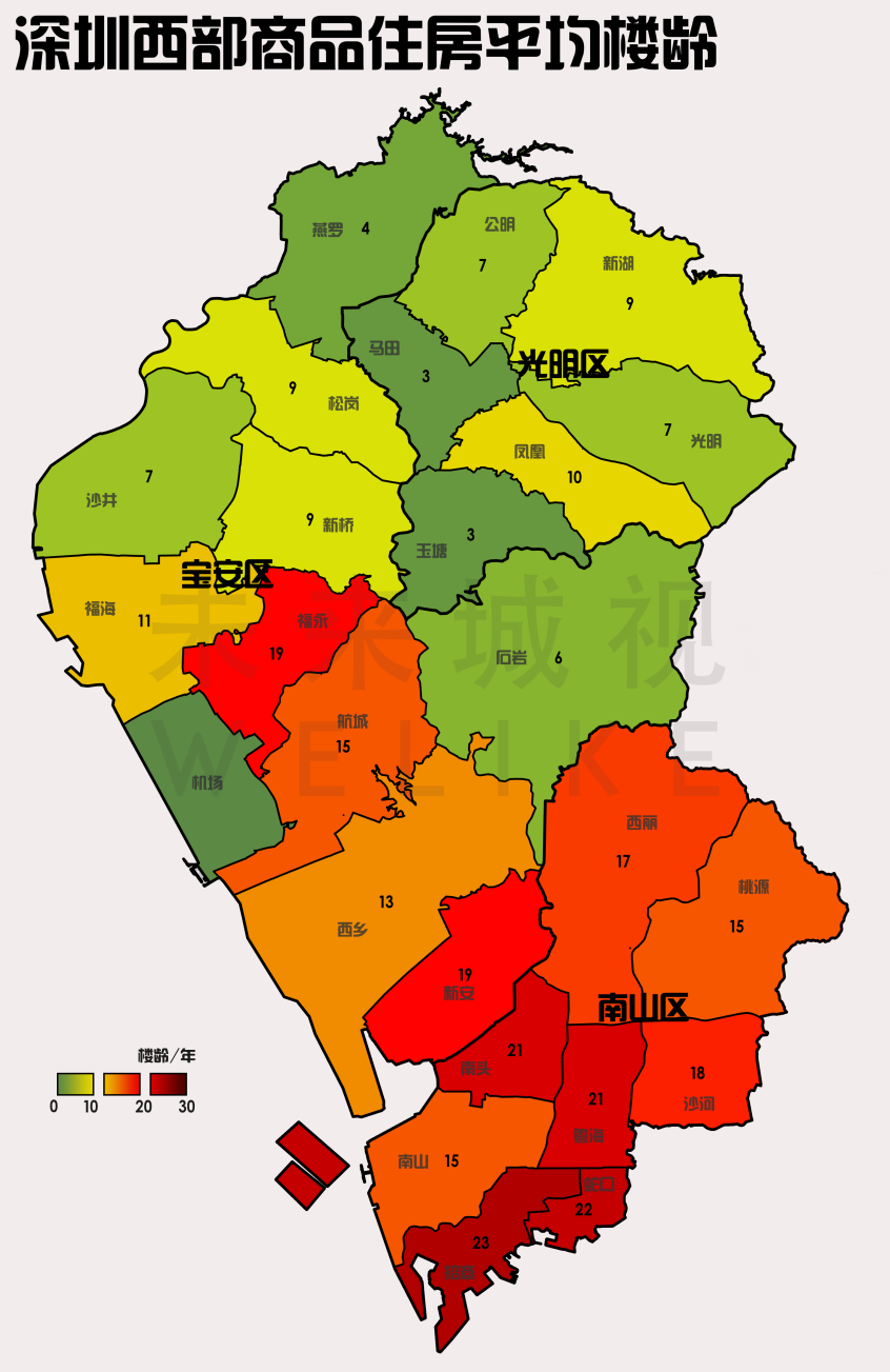 2.观澜、光明、松岗、坑梓、马峦最年轻。年轻的区域意味着城市建设的后发优势,比如光明新城公园附近的生态环境和路网规划是先发区域难以达到的。而且,这些区域将来如果有人口导入,一定是成群结队且购买力强的年轻人。