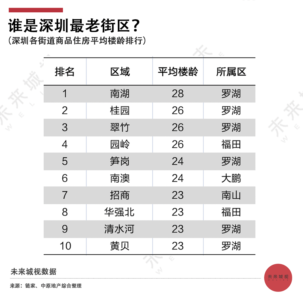 4.最老十片区罗湖占六席。文锦渡、罗湖口岸一带是深圳最早开发的地方,昔日的繁华也意味着城市更新的难度和人口结构的老龄化。