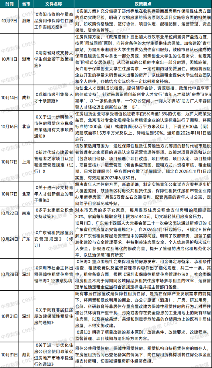 表:2025年10月地方出台的住房租赁市场指导与支持政策