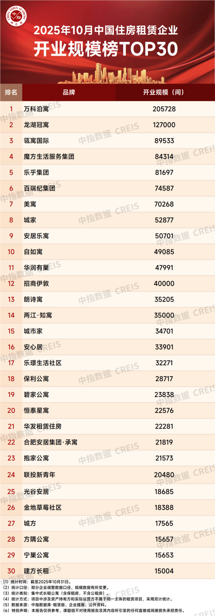 规模排行:2025年10月,TOP30企业开业规模榜合计开业房源量增长至140.7万间,管理规模榜合计管理房源量增长至197.7万间。