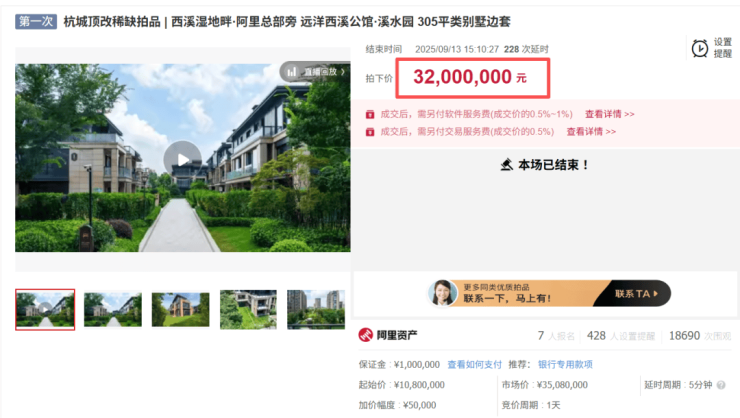 典型如杭州远洋西溪公馆的一处类别墅住宅,起拍总价1080万元,经过255轮竞价后以3200万元成交,较起拍价溢价率高达196%,折合成交单价约10.5万元/平方米,仅低于市场价格10%左右。