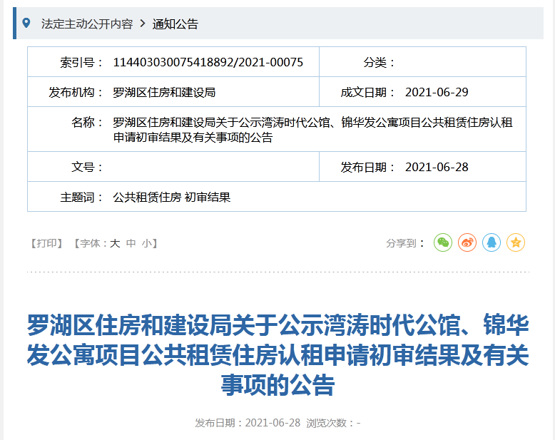 深圳市罗湖区住房和建设局于2021年5月25日发布了《罗湖区住房和建设局关于湾涛时代公馆、锦华发公寓项目公共租赁住房认租及有关事项的通告》,认租工作于2021年6月6日结束。现已完成3927户认租家庭认租资格的初审核查。现将核查结果公示如下: