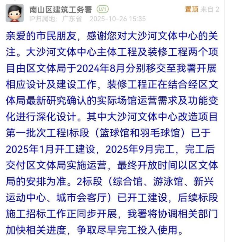 其中,大沙河文体中心改造项目第一批次工程Ⅰ标段(篮球馆和羽毛球馆)已于2025年1月开工建设,2025年9月完工,完工后交付区文体局实施运营,最终开放时间以区文体局的安排为准。2标段(综合馆、游泳馆、新兴运动中心、城市会客厅)已开工建设,后续标段施工招标工作正同步开展,南山区建筑工务署将协调相关部门加快相关进度,争取尽早完工投入使用。