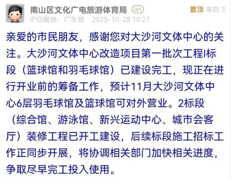 对此,南山区文化广电旅游体育局回应称,大沙河文体中心改造项目第一批次工程Ⅰ标段(篮球馆和羽毛球馆)已建设完工,现正在进行开业前的筹备工作,预计11月大沙河文体中心6层羽毛球馆及篮球馆可对外营业。2标段(综合馆、游泳馆、新兴运动中心、城市会客厅)装修工程已开工建设,后续标段施工招标工作正同步开展,将协调相关部门加快相关进度,争取尽早完工投入使用。