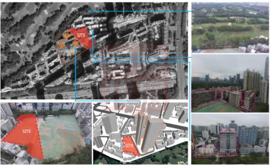 项目场地现状已拆除原有建筑,用地地形北高南低,约有6米左右高差,东侧为现状多层小区,与红线紧邻,边界条件与关系较为复杂,西侧为新光制药厂城市更新项目,为三栋200米超高层建筑与南侧一栋不到百米建筑组成花园小区。场地未来主要依托南侧新沙路与西侧小区内部公共开放道路组织学校交通。 东侧现状多层小区有更新的可能,设计需考虑结合东侧小区更新后贡献用地进行学校扩建的可能性。
