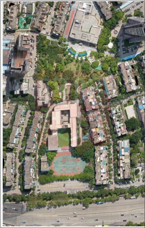 福田区华新小学东面毗邻阳明山庄,南面毗邻信苑花园及小区内部道路,西侧为华富中学,北侧为笔架山公园及内部道路。校园红线范围内现状地势呈北高南低的态势,学校主入口位于用地西南侧与小区道路相接,南侧道路为小区内部消防车道,宽约5米,东低西高;西侧毗邻华富中学;北侧现状约为5米高的护坡,西北侧为现状校园出入口;东侧、南侧为高层住宅楼。