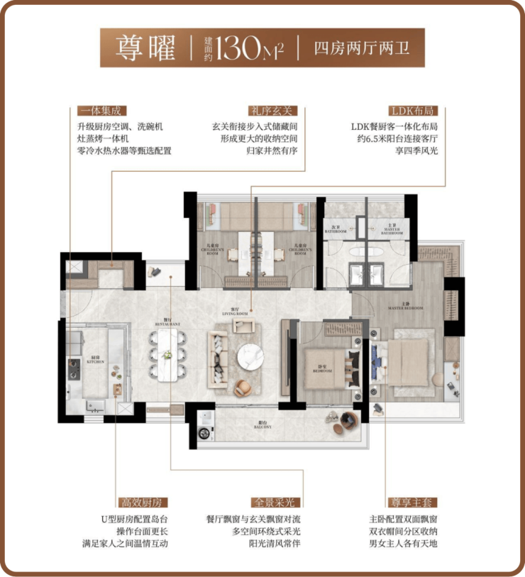 而103-130平方米的四房户型则普遍采用双跨宽景阳台设计,提高采光和通风效果。