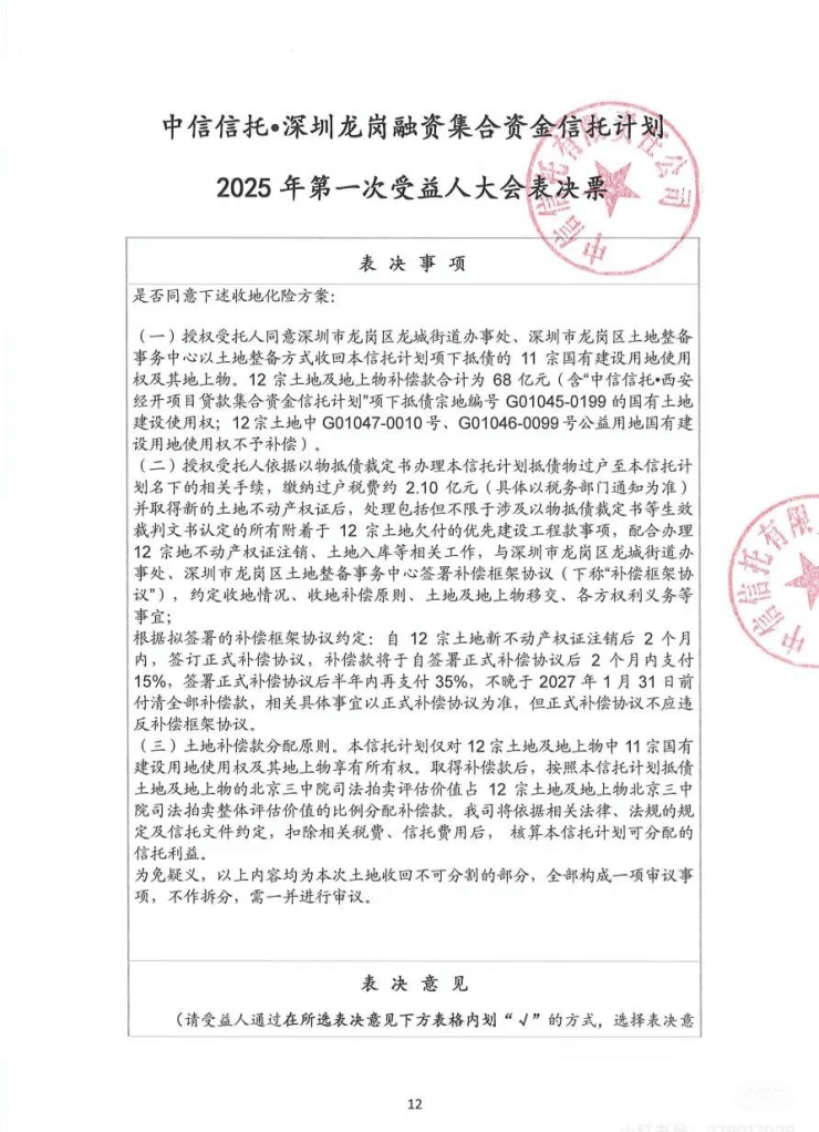 2025年7月15日,网上流传出一张盖了“中信信托有限责任公司”红章的《中信信托深圳龙岗融资集合资金信托计划•2025年第一次受益人大会表决票》图片。