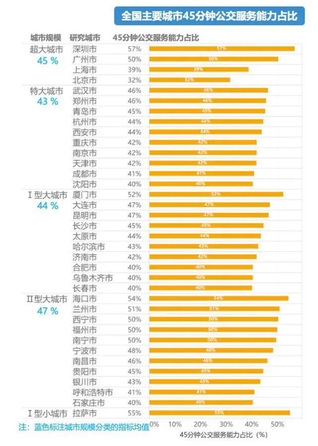 其中,深圳45分钟以内通勤人口比重为76%,在超大城市中比重较高。