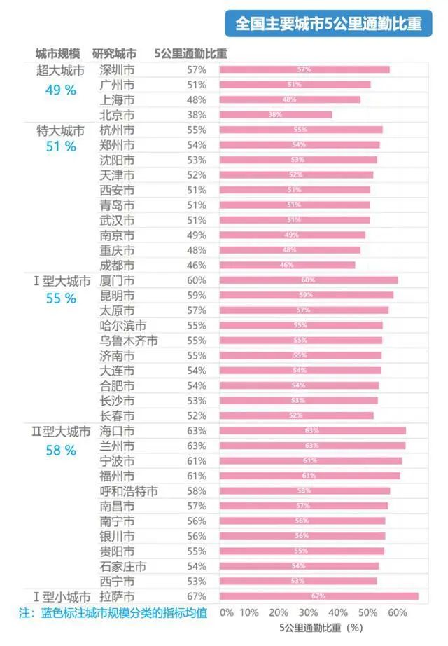 《报告》以距离小于5公里作为幸福通勤的指标,因此距离小于5公里的通勤人口占比也成为了衡量整个城市职住平衡和通勤幸福的指标。