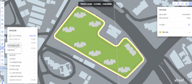 该板块基于平台搭载的特别核心技术“智能设计引擎”,与内嵌的相关城市、建筑规范模块联动,通过对CAD图纸、图层、内容等对象的AI识别,进而对指标进行实时的自动校验与核查,并能从尺寸及面积核查、漏项核查、特定规则项核查等方面可进行智能审查。
