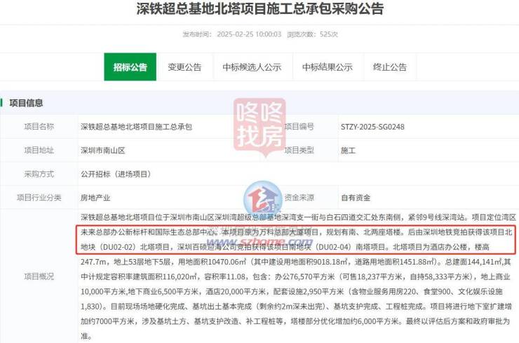 今年2月,深圳地铁公布了深铁超总基地北塔项目施工总承包的招标公告,并且于今年8月中标。