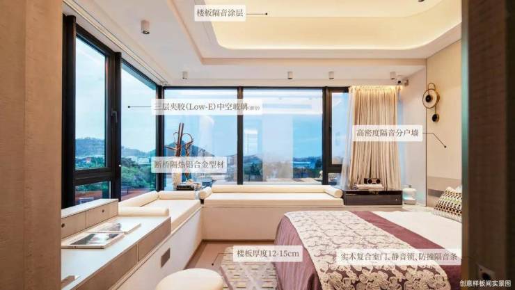 门、窗、楼板、墙体,多重静音体系有效降音降噪,卧室采用三层夹胶 (Low-E) 中空玻璃与加厚楼板有效阻隔外界喧嚣,舒享360度静谧时光。