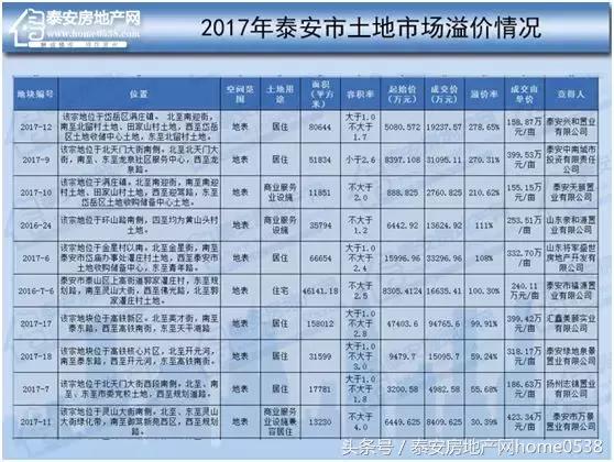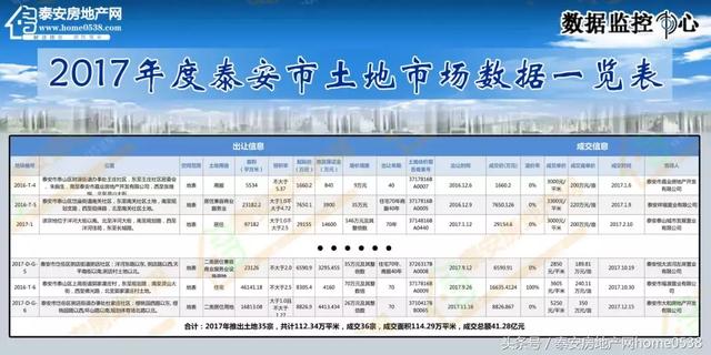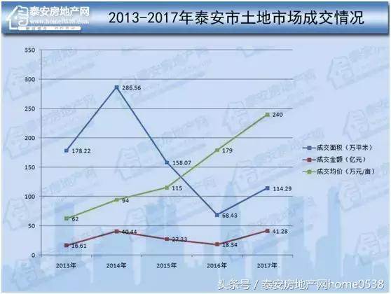 【泰安房地产网讯】2017年度泰安土地市场已正式落下帷幕,据泰安房地产网不完全统计,2017年泰安市新推土地35宗(不含工业用地),新增面积112.34万㎡,同比上升23.29%,2017年全市成交土地36宗(不含工业用地,包含2016年推出土地2宗),成交面积114.29万㎡,同比上升67.00%。成交金额约41.28亿元,创近五年来历史新高。地块成交均价约为240万元/亩,同比上升34.08%,总体来说,2017年泰安土地市场量价齐升。