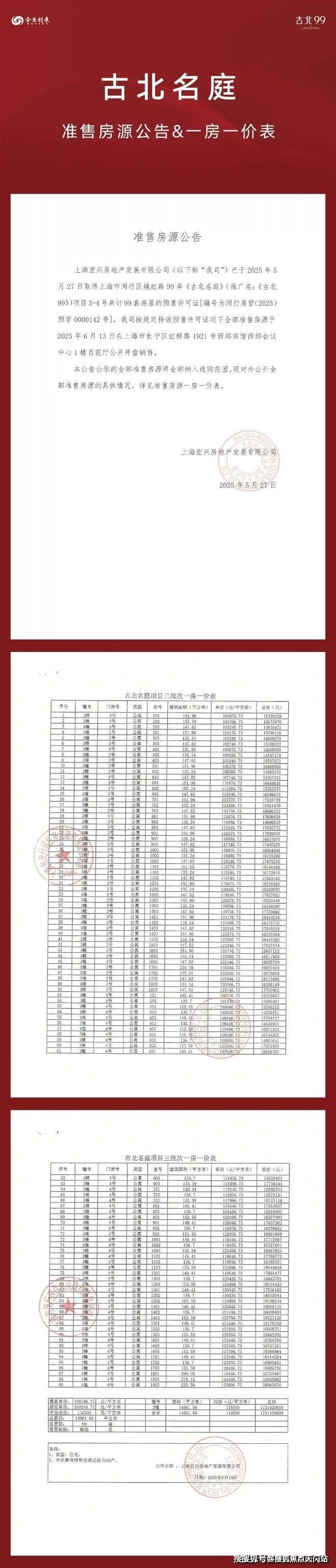 据悉, 【古北99】加推2号楼,合计99套房源:包括建面约135-154㎡3-4房,建面建面约230-299㎡复式房。均价约为11.65万元/㎡,即将入市,前期少量房源可直接认购!