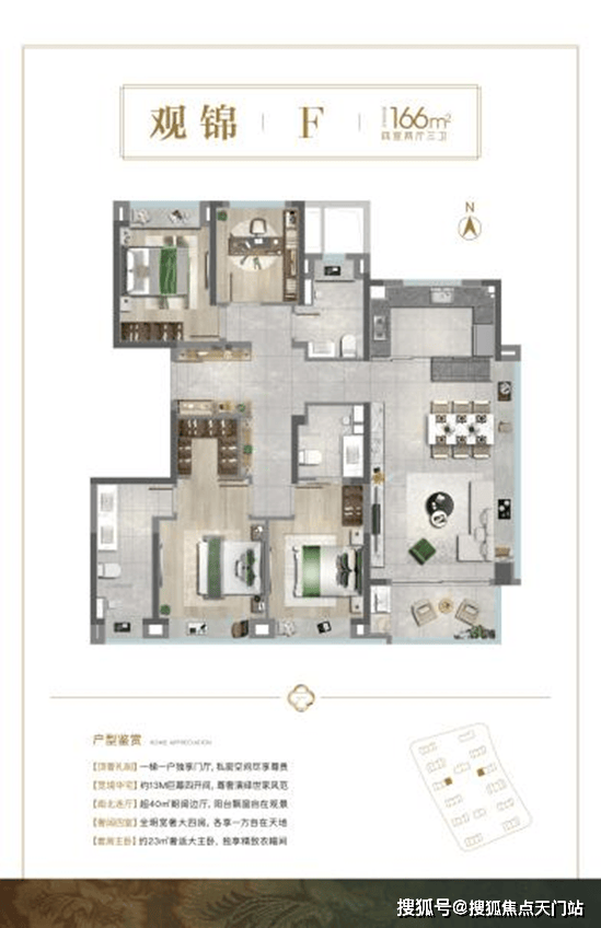 南向3.5面宽边厅的户型设计, 一梯一户的电梯厅基本可以独享;客餐厅一体化设计, 270°的超广视角,居住者足不出户就能坐拥长卷式观景体验; 南向双套卧设置,实现精致而又尊奢的世家生活风范。